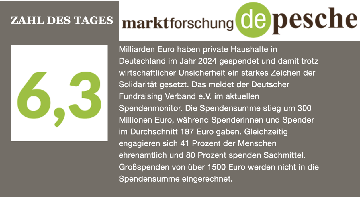 Der Deutsche Spendenmonitor 2025 zeigt: Trotz schlechter Wirtschaftslage bleiben die Menschen in Deutschland großzügig. Insgesamt spendeten sie privat 6,3 Milliarden Euro – das sind 300 Millionen Euro mehr als im Vorjahr – wobei Großspenden ab 1.500 Euro noch gar nicht berücksichtigt sind. Den Deutschen Spendenmonitor gibt der Deutsche Fundraising Verband (DFRV) gemeinsam mit dem Deutschen Zentralinstitut für soziale Fragen (DZI) heraus. Die Studie mit 5.008 Befragten wird von Bonsai durchgeführt. Über den Deutschen Spendenmonitor berichteten u.a. der Newsletter von marktforschung.de, die Evangelische Zeitung und WIR IM NETZ.